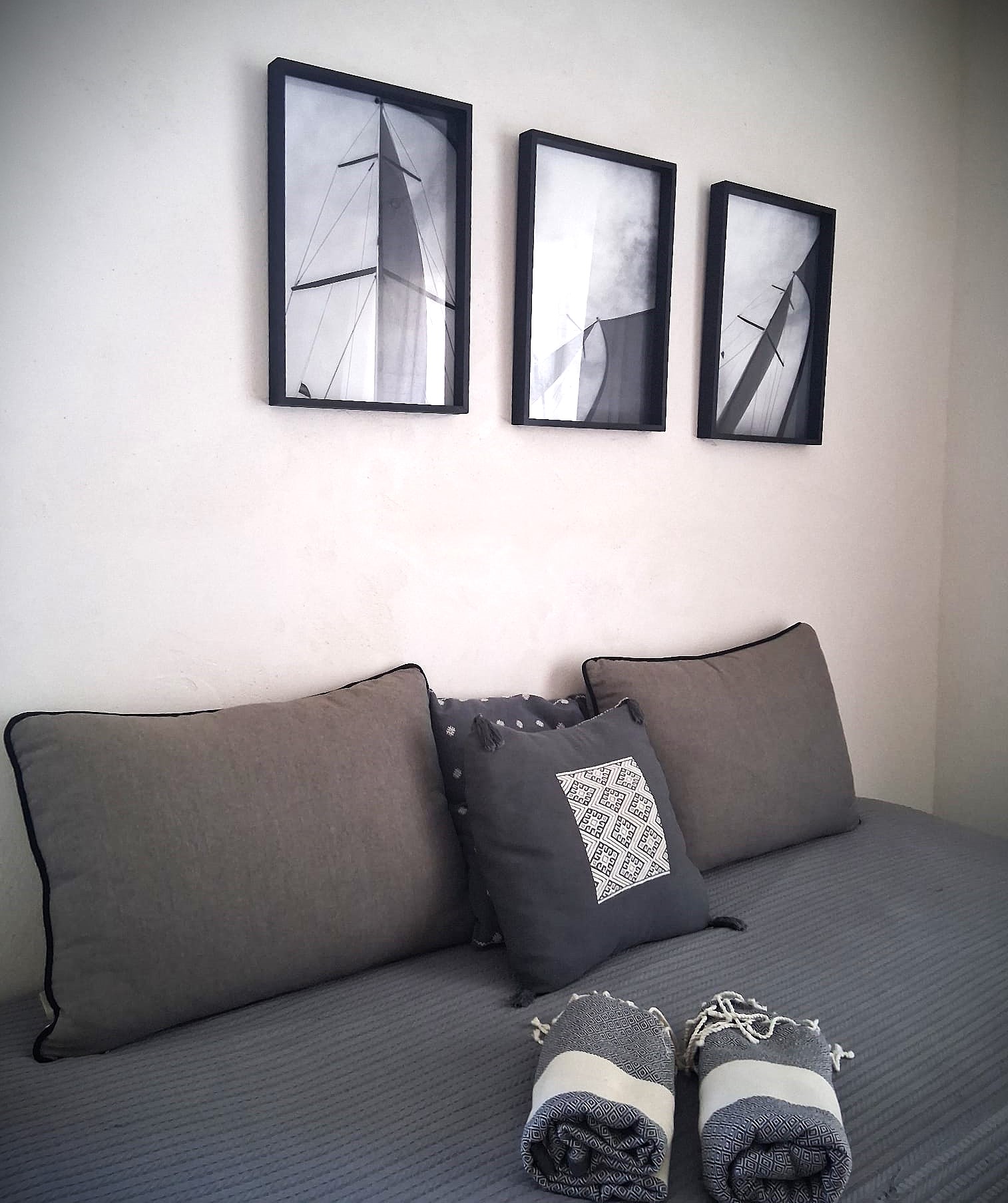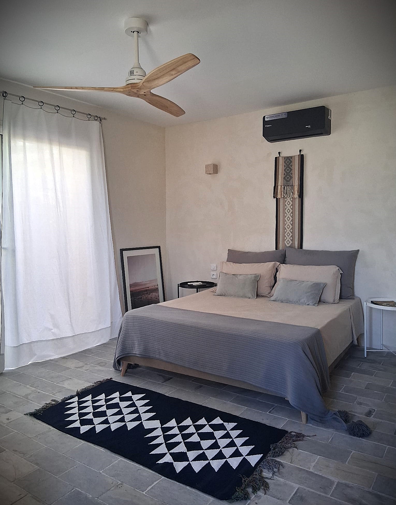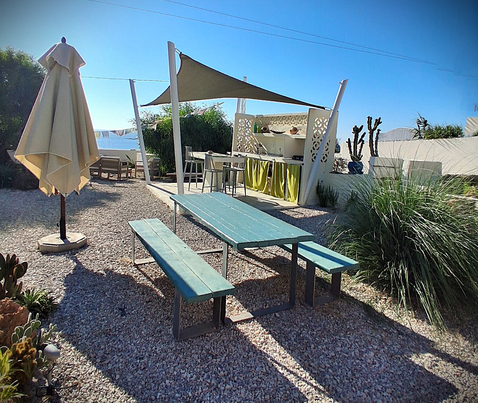 Felfel vit par et pour son grand jardin privé, équipé d’une cuisine extérieure où préparer ses repas face à la mer. Un espace entier dédié à la vie en plein air, entre le bleu de la Méditerranée et l’ombre des arbres. À l’intérieur, des tons chaleureux créent un cocon doux pour se reposer après des journées à vivre dehors.